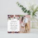 Convites de casamento elegantes e econômicos com butterum e ameixa, com penas boho aquareladas, flores de rosa e peônia, uma foto dos futuros noivos e um modelo de casamento informal fácil de personalizar.