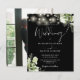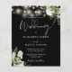 Este convite de casamento preto e branco econômico e elegante, apresentando lindas luzes de corda e folhagens florais, pode ser personalizado com suas informações em tipografia sofisticada com sua foto especial no verso. Criado por Thisisnotme©