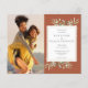 Com delicadas folhas de verde água e uma moldura dourada em um fundo de terracota, este convite de casamento botânico econômico pode ser personalizado com suas fotos especiais e detalhes do dia do casamento. Criado por Thisisnotme©
