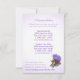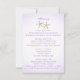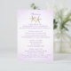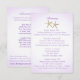 Cartão de informações de convite de casamento de praia com uma hortênsia roxa e concha de um lado e estrelas-do-mar do outro. Itinerário de um lado e acomodações do outro. Personalize o texto conforme preferir.
