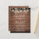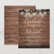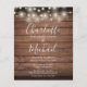 Um convite de casamento rústico e elegante com luzes de corda bonitas, nomes em estilo de assinatura e tipografia chic em um fundo de madeira rústica. Criado por Thisisnotme©