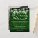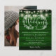 Com belas luzes de cordão e uma guirlanda floral desenhada à mão, este convite de casamento de madeira rústica e elegante pode ser personalizado com suas informações em letras elegantes sobre um fundo de painéis de madeira esmeralda verde e sua foto especial no verso. Projetado por Thisisnotme©