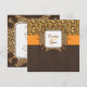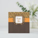 Convite de Casamento com impressão de leopardo marrom, amarelo e laranja com acentos laranja e foto de papel marrom com aparência texturizada 3D. Um convite de casamento ousado e divertido com tema de safári africano com os nomes dos noivos na frente e o texto do convite de casamento no verso do cartão. Design por Elke Clarke © Gráficos licenciados.