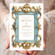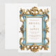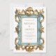 Este convite de casamento elegante apresenta uma moldura ornamentada em estilo rococó vintage em azul pastel e dourado. Personalize o texto dourado com seus nomes e detalhes do casamento.