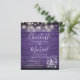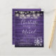 Um convite de casamento rústico e sofisticado com luzes de corda, potes de pedreiro, nomes em estilo próprio e tipografia elegante sobre um fundo de madeira roxa rústica. Desenvolvido por Thisisnotme