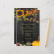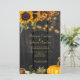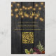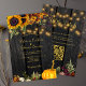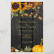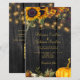 Convite de casamento com QR code para RSVP online com orçamento acessível, com girassóis do outono, flores de outono e abóbora, em um fundo de madeira escura de celeiro com luzes de corda. +++++++++++++++++++++++ Ideal para casamentos ao ar livre em celeiros rústicos.