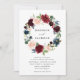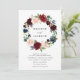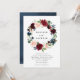 Elegante convite de casamento floral apresentando seus nomes circundados por uma grinalda floral em aquarela burgundy, rosa desbotado e azul naval com folhas verdes exuberantes. Adicione os detalhes do seu casamento abaixo para um convite perfeito para casamentos de primavera e verão.