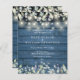 Um convite de casamento para o orçamento rústico com luzes bonito de cordas e salões e lilás que caem sobre um pano de fundo azul de madeira rústica e seus detalhes de casamento são definidos em texto elegante clássico. Projetado por Thisnotme©