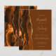 A borda esquerda deste elegante convite de casamento moderno apresenta uma laranja queimada e uma aquarela marrom aparada com falsa brilho dourado. O texto personalizável combina manuscrito dourado, copperplate e fontes itálicas em um fundo marrom noz. O lado inverso apresenta um design agate correspondente.