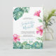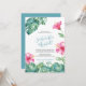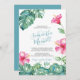 Este simples convite de casamento mostra seus nomes em uma tipografia de script manuscrita de na moda com detalhes de eventos em uma seringa de cinza de carvão clássico, se houver um fundo branco nítido cercado por uma carapaça das flores de hibisco rosa-d-água e folhas de palma de monstera em tons de azul, verde e turquesa originais. O cartão de convite reverte para uma cor azul tropical complementar. Uma opção botânica, mas elegante, para praia casual e casamentos costeiros. Para ver toda a minha suíte de papelaria de casamento, visite DoTellABelle no Zazzle.