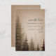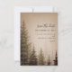 Um convite de casamento elegante para salvar a data com uma ilustração de árvores perenes sobre um fundo marrom.