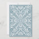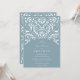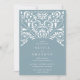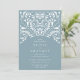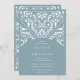 Elegantes convites para casamentos vintage em azul empoeirado com um toque de ornamentado aqua detalhando que evoca o aspecto do papel cortado em estilo papel picado.