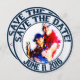 Cartões de convite redondos com tema de casamento de beisebol. Este é personalizado para um cliente específico. A frente do cartão é uma moldura/inserção de foto. Anéis azuis interno e externo com uma foto personalizada no centro. Círculos de texto em vidro decorativo na parte superior e diz: SALVE A DATA. Mais círculos de texto em vidro na parte inferior e diz a data do casamento dos clientes. Este texto está em ambos os lados do cartão. O fundo da borda externa é listras azuis e brancas de beisebol. No verso do cartão, você tem o mesmo texto no topo e na parte inferior em um fundo listrado. Pequenos enfeites de coração vermelho sentam-se entre as palavras. O fundo do centro é branco sólido com bolas de beisebol espalhadas por todo o lado. Texto decorativo em vidro diz: Mathew Howard e Sylvia Newcomb estão subindo para o home plate e rebatendo 1000 que seu amor vai durar para sempre. As equipes se fundirão em uma em 11 de junho de 2016. Os convites com tema de