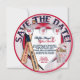 Cartões redondos de "Save the Date" com tema de casamento de beisebol. Este é personalizado para um cliente específico. A frente do cartão é uma moldura/inserção de foto. Anéis vermelhos externos e azuis internos com uma foto personalizada no centro. Círculos de texto em vidro decorativos em vermelho e azul na parte superior que dizem: SAVE THE DATE. Mais círculos de texto em vidro na parte inferior que dizem: DATA DO CASAMENTO DO CASAL. A borda externa tem listras de beisebol vermelhas, brancas e azuis. No verso do cartão, há o mesmo texto no topo. Dois tacos de madeira com texto gravado adornam o texto à esquerda. O fundo do centro é vermelho sólido com um gráfico de "home plate" no centro e três bolas de beisebol repousam sobre o "home plate" para segurar a data. Uma caixa de pipoca com biscoitos personalizados adorna a parte inferior direita da moldura. O texto decorativo no "home plate" diz: ELE e ELA (seus nomes) estão subindo para o "home plate" e apostando 1000 que seu amor durará para sempre. Por favor, junte-se a nós na celebração enquanto juramos nosso amor e devoção um ao outro. A próxima área de texto diz: A celebração da festa certamente será um sucesso