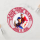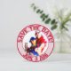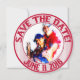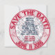 Cartões redondos de "Save the date" com tema de casamento de beisebol. Este é personalizado para um cliente específico. O lado frontal do cartão é uma moldura/inserção de foto. Anéis internos e externos vermelhos com uma foto personalizada no centro. Círculos de texto de vidro decorativos ao redor da parte superior e lêem: SAVE THE DATE. Mais círculos de texto de vidro ao redor da parte inferior e lêem a data do casamento dos clientes. Este texto está em ambos os lados do cartão. O fundo da borda externa é de listras vermelhas e brancas de beisebol. No verso do cartão, você tem o mesmo texto na parte superior e inferior em um fundo listrado. Pequenos enfeites de coração ficam entre as palavras. O fundo do centro é branco sólido com bolas de beisebol espalhadas por toda parte. O texto decorativo de vidro diz: ELE e ELA (seus nomes) estão avançando para a base inicial e rebatendo 1000 para que seu amor dure para sempre. As equipes se fundirão em uma só em... sua