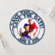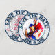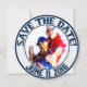 Cartões de convite redondos com tema de casamento de beisebol. Este é personalizado para um cliente específico. A frente do cartão é uma moldura/inserção de foto. Anéis azuis interno e externo com uma foto personalizada no centro. Círculos de texto em vidro decorativo ao redor da parte superior e diz: SALVE A DATA. Mais círculos de texto em vidro ao redor da parte inferior e diz a data do casamento dos clientes. Este texto está em ambos os lados do cartão. O fundo da borda externa é listras azuis e brancas de beisebol. No verso do cartão, você tem o mesmo texto na parte superior e inferior em um fundo listrado. Pequenos enfeites de coração vermelho sentam-se entre as palavras. O fundo do centro é branco sólido com bolas de beisebol espalhadas por todo o lado. Texto decorativo em vidro diz: Mathew Howard e Sylvia Newcomb estão subindo para o home plate e apostando 1000 que seu amor vai durar para sempre. As equipes se fundirão em uma em 11 de junho de 2016. Os convites de