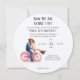 Um convite de casamento moderno e romântico que apresenta um casal encantador andando de bicicleta, simbolizando amor, alegria e uma jornada compartilhada juntos. A ilustração suave e o layout limpo criam um design quente e convidativo perfeito para casamentos contemporâneos.