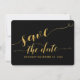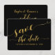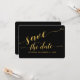 Convite de casamento de fundo preto clássico com caligrafia dourada em fonte Swash Save The Date envelope card.
