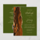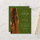 Economize o custo de imprimir e enviar cartões RSVP separados com este elegante convite de casamento de orçamento integral. A borda esquerda apresenta uma cor de água laranja queimada e ferrugem, borda agitada com brilho dourado. O texto personalizável combina manuscritos, placas de impressão e fontes itálicas em um fundo verde-oliva. O verso fornece espaço para detalhes do casamento em um fundo verde-oliva sólido, junto com um código QR que os convidados podem digitalizar para visitar seu site e RSVP.