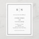 Estes elegantes, modernos e orçamentários convites para casamento são impressos em uma folha de papel. Eles apresentam um simples design de texto minimalista preto-e-branco, com um quadro clássico na fronteira. Adicione suas iniciais ou monograma para torná-las completamente suas. A parte de trás do convite tem espaço para adicionar qualquer detalhe de convidado, além de um código de QR digitalizável para que os convidados possam RSVP on-line no seu site de casamento.