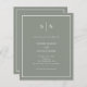 Estes elegantes, modernos e orçamentários convites para casamento são impressos em uma folha de papel. Eles apresentam um simples design de texto verde-sábio e minimalista branco, com um quadro clássico na fronteira. Adicione suas iniciais ou monograma para torná-las completamente suas. A parte de trás do convite tem espaço para adicionar qualquer detalhe de convidado, além de um código de QR digitalizável para que os convidados possam RSVP on-line no seu site de casamento.