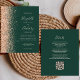 A borda esquerda deste elegante convite de casamento moderno apresenta uma borda falsa de pêssego. O texto personalizável combina manuscrito de pêssego, fontes em copperplate e itálico em um fundo verde esmeralda. O verso fornece espaço para detalhes do casamento em um fundo verde sólido, junto com um código QR que os convidados podem digitalizar para visitar seu site e RSVP, o que economiza o custo de imprimir e enviar cartões RSVP separados.