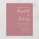 Este simples convite de casamento moderno contém um texto branco sobre um fundo poeirento de rosa. Adicione os nomes da noiva e do noivo na caligrafia de escrita manual do na moda e os detalhes na fonte sans serif. O verso fornece espaço para detalhes do casamento em um fundo de rosa poeirento sólido, junto com um código QR que os convidados podem digitalizar para visitar seu site e RSVP. NOTA: os envelopes não são incluídos automaticamente nestes convites de orçamento, portanto lembre-se de escolher a opção "envelopes brancos"!