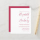 Este simples convite de casamento moderno apresenta um texto magenta cor-de-rosa sobre um fundo branco. Adicione os nomes da noiva e do noivo na caligrafia de escrita manual do na moda e os detalhes na fonte sans serif. O verso fornece espaço para detalhes do casamento em um fundo magenta sólido, junto com um código QR que os convidados podem digitalizar para visitar seu site e RSVP. NOTA: os envelopes não são incluídos automaticamente nestes convites de orçamento, portanto lembre-se de escolher a opção "envelopes brancos"!