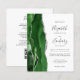 A borda esquerda deste elegante convite de casamento moderno apresenta um caçador de aquarela verde agata borda com falso brilho prateado. O texto personalizável combina manuscrito, copperplate e fontes itálicas em cinzas de carvão em um fundo branco. O verso fornece espaço para detalhes do casamento em um fundo branco sólido, junto com um código QR que os convidados podem digitalizar para visitar seu site e RSVP, o que economiza o custo de imprimir e enviar cartões RSVP separados.