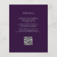 A borda direita deste elegante convite de casamento moderno apresenta uma cor d'água púrpura e borda agitada com falso brilho prateado. O texto personalizável combina fontes de cinza prateada se, copperplate e itálico estiverem em um fundo de ameixa. O verso fornece espaço para detalhes do casamento em um fundo de ameixa sólida, junto com um código QR que os convidados podem digitalizar para visitar seu site e RSVP, o que economiza o custo de imprimir e enviar cartões RSVP separados.