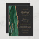 Economize o custo de imprimir e enviar cartões RSVP separados com este elegante convite de casamento de orçamento integral. A borda esquerda apresenta uma esmeralda verde aquarela agate border aparada com brilho dourado. O texto personalizável combina manuscrito dourado, fontes em copperplate e itálico em um fundo preto de slate. O verso fornece espaço para detalhes do casamento em um fundo preto de ardósias sólidas, junto com um código QR que os convidados podem digitalizar para visitar seu site e RSVP.