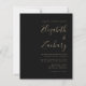 Economize o custo de imprimir e enviar cartões RSVP separados com este convite de casamento simples e moderno, com texto dourado em fundo preto. Adicione os nomes da noiva e do noivo na caligrafia de escrita manual do na moda e os detalhes na fonte sans serif. O verso oferece espaço para detalhes do casamento, junto com um código QR que os convidados podem digitalizar para visitar seu site e RSVP.