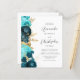 A borda esquerda deste elegante convite de casamento moderno apresenta um azul lacrimogêneo e uma borda floral aqua aparada com folhagem de folhas falsas de ouro. O texto personalizável combina o script de cinza de carvão e as fontes sans serif em um fundo branco. O verso fornece espaço para detalhes do casamento em um fundo branco sólido, junto com um código QR que os convidados podem digitalizar para visitar seu site e RSVP, o que economiza o custo de imprimir e enviar cartões RSVP separados.