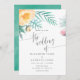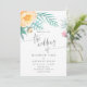 Convites de casamento exóticos, cor-de-rosa e amarela, com tipografia de escrita manual, com peões, eucaliptos, roseqos, succultos, lisianthus, folhas de menthol e suculentes