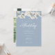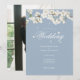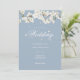 Convite de casamento com flores azuis empoeiradas e flor branca apresentando delicadas flores da primavera emoldurando os detalhes do seu casamento em letras brancas elegantes sobre um fundo azul empoeirado. Personalize com as informações do seu evento especial. O verso apresenta sua própria foto especial. Concebido por Thisisnotme