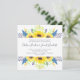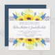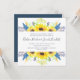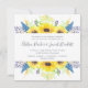 Nosso convite de casamento Flowerfields em um formato quadrado único enquadra seus detalhes de casamento com uma borda superior e inferior de girassóis de cor amarela ensolarada, púrpura e azul, e folhagem verde exuberante.