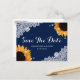 Cartão postal de convite de casamento floral rústico azul marinho com flores de girassol e aniagem adornada com renda floral branca e luzes cintilantes.