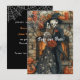 Cartão de casamento de Halloween com casal de esqueletos fofos vestidos com suas melhores roupas. A noiva usa um vestido preto com imagens de caveiras e tem abóboras no cabelo. O noivo usa um terno preto e chapéu de copa alta. Há grandes aranhas pretas rastejando enquanto um morcego pendura no consolo. Convite de casamento gótico que pode ser personalizado para atender às suas necessidades.