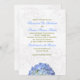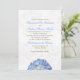 Convites de casamento de flores de hydrangea azul pálida. Cartões verticais de 5 x 7 polegadas com imagem floral realista na parte inferior. O texto azul e verde é impresso sobre um plano de fundo floral claro.