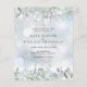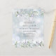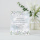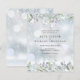 Convite de casamento de inverno com água-forte verde floral sage lilac orçamento com lindas folhas de sage e lilac que caem sobre tipografia elegante em um fundo de flocos de neve. Projetado por Thisisnotme