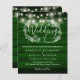 Com luzes bonito de cordas e uma terra floral desenhada à mão, este elegante convite para casamento de madeira rusticada pode ser personalizado com a sua informação em cartaz chic num fundo de painéis de madeira verde esmeralda. Projetado por Thisnotme©