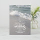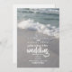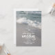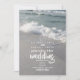 Um convite de casamento com uma foto de ondas oceânicas e uma praia arenosa. Personalize o texto na frente.