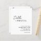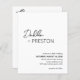 Orçamento preto e branco moderno, tudo em um convite de casamento, com um design simples e mínimo com o nome da noiva em um roteiro elegante e o nome do noivo em uma fonte sans serif contemporânea. Abaixo, no canto inferior direito, estão os detalhes do evento em um layout minimalista. A parte traseira tem seus detalhes adicionais e o Código QR, para que você possa ignorar a placa do compartimento e a placa RSVP.