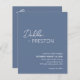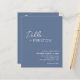 O orçamento moderno e empoeirado azul, tudo em um convite de casamento, com um design simples e mínimo com o nome da noiva em um roteiro elegante e o nome do noivo em uma fonte moderna de sans serif. Abaixo, no canto inferior direito, estão os detalhes do evento em um layout minimalista. A parte traseira tem seus detalhes adicionais e o Código QR, para que você possa ignorar a placa do compartimento e a placa RSVP.