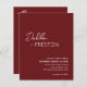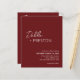 Orçamento moderno de burgundy, tudo em um convite de casamento, com um design simples e mínimo com o nome da noiva em um roteiro elegante e o nome do noivo em uma fonte moderna de sans serif. Abaixo, no canto inferior direito, estão os detalhes do evento em um layout minimalista. A parte traseira tem seus detalhes adicionais e o Código QR, para que você possa ignorar a placa do compartimento e a placa RSVP.