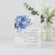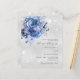 Fundo de aspecto fino prateado decorado com florais azuis e faxes brilhantes. Personalize e adicione seus nomes e detalhes do casamento. Letras pretas coloridas. Voltar: adicione o URL do seu site de casamento ao código QR para obter detalhes e/ou RSVP. 1 folha = 1 convite de casamento impresso de ponta a ponta.