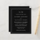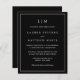 Simples convite de casamento orçamentário com um design moderno, mas elegante, com seu monograma de duas letras no topo e seus detalhes cercados por uma fronteira fina. Todo o texto está branco sobre um fundo preto. As fontes e as cores de fundo podem ser alteradas para qualquer cor desejada clicando no botão "personalizar". Estes convites baratos de casamento são excelente de um casal minimalista.
