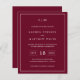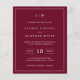Simples convite de casamento orçamentário com um design moderno, mas elegante, com seu monograma de duas letras no topo, um layout ousado de data e seus detalhes cercados por uma borda fina. Todos os elementos de design estão em branco sobre um fundo burgundy e podem ser alterados na ferramenta de edição de design. Um design chic e na moda que é excelente para um casal minimalista.
