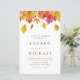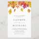 Convide convidados para este convite de casamento no outono. Apresenta a camada aquosa de folhas em tons de outono com um padrão correspondente. Personalize adicionando nomes, datas, horários e outros detalhes. Este convite de casamento é perfeito para casamentos outono. Itens correspondentes estão disponíveis.