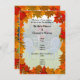 Adicione as informações do seu casamento de outono a este belo cartão. Todo o texto é ajustável para mover, redimensionar e alterar a fonte e a cor. Converta isso para qualquer ocasião. No meio do campo, uma mesa branca, com aspecto antigo, com cadeiras. Por cima da mesa está um pote de flores com flores vermelhas. Ao fundo estão as árvores que começam a mudar com o outono antecipado.